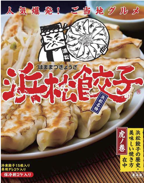 1箱に冷凍ギョウザ15粒、 専用タ レ2個、 保冷剤2個、 浜松餃子の歴 史と美味しい焼き方 「虎ノ巻」が入 っています。