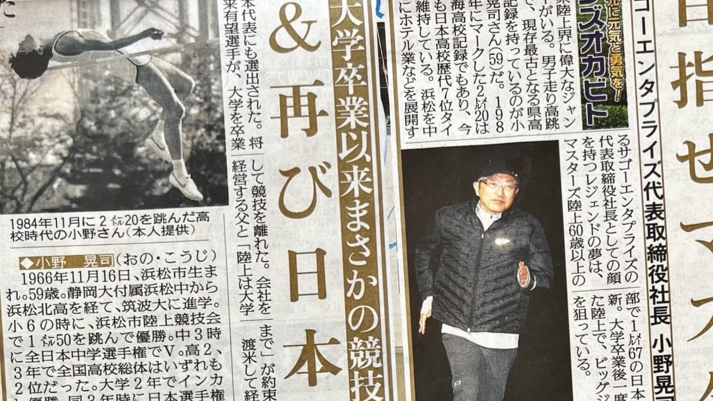 県陸上界に偉大なジャンパーがいる。男子走り高跳びで、現存最古となる県高校記録を持っているのが小野晃司さん(59)だ。1984年にマークした2メートル20は東海高校記録でもあり、今でも日本高校歴代7位タイを維持している。浜松を中心にホテル業などを展開するサゴーエンタプライズの代表取締役社長としての顔を持つレジェンドの夢は、マスターズ陸上60歳以上の部で1メートル67の日本記録更新。大学卒業後、一度は離れた陸上でビッグジャンプを狙っている。